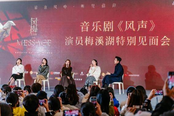 根据麦家原著改编·阿云嘎作品的现象级音乐剧《风声》近日在长沙梅溪湖大剧院举办了线下见面会。总制作人阿云嘎与“李宁玉”饰演者蒋倩如、郭耀嵘,“顾小梦”饰演者陈昊宇、徐瑶亮相长沙梅溪湖大剧院,与观众分享台前幕后的创作故事。此次梅溪湖特别见面会,也带着观众深入感受了这部音乐剧背后的情感张力与艺术追求。