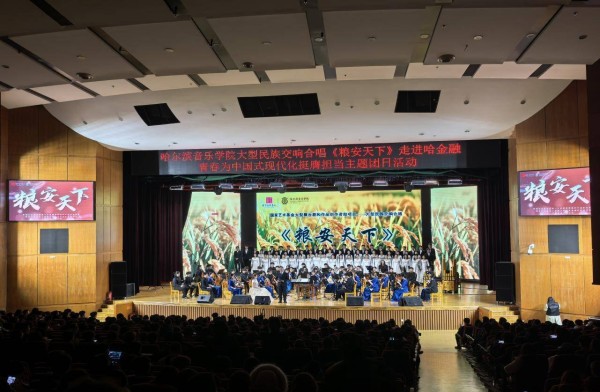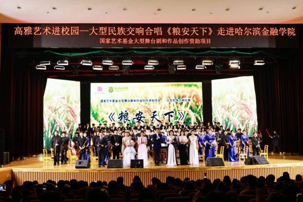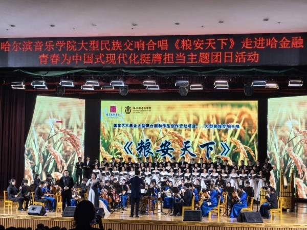 由哈尔滨音乐学院倾力打造,黑龙江省文化和旅游厅、黑龙江省文学艺术界联合会、哈尔滨市文化广电和旅游局、哈尔滨音乐厅共同推出的国家艺术基金资助项目——大型民族交响合唱《粮安天下》,11月23日晚在哈尔滨金融学院震撼上演,这也是该项目的收官演出。