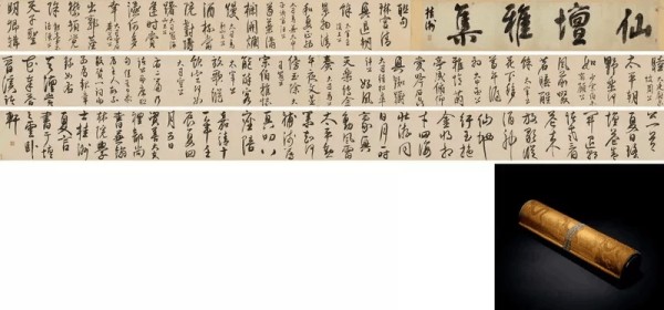 在“大观·古代”板块,明代嘉靖朝“铁骨宰相”夏言《行书仙坛雅集诗》以4025万元成交,这件11米巨制记录了嘉靖朝六部尚书的雅集盛事,若以身份之尊贵而言,可称 “文人雅集第一” ,兼具历史、文学与艺术价值。此卷原为荣宝斋所藏,并出版于《中国古代书画图目》第一册。杨仁恺先生记载“夏氏作品少见,此卷为真迹。”