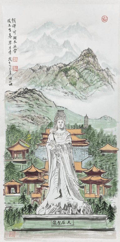 作为深耕国画领域数十载的艺术大家,陈升栋先生深谙传统文化精髓,更善于捕捉信仰符号的精神内核。《天后圣像》便是其以笔墨致敬海神信仰的匠心之作:画作中,天后圣像玉立千仞苍峦之上,身姿端庄肃穆,目光慈悲而坚定,遥接远方层峦叠嶂,尽显“庇佑四海”的神圣气场;圣像周围梵宫巍峨,殿宇鳞次栉比,被氤氲云霭环绕,营造出幽深静谧的宗教氛围;脚下潮平岸阔,春风送暖,碧波万顷的沧溟之上,仿佛涌动着天后护佑万民的浩荡初心。整幅作品构图恢弘大气,墨色温润庄重,线条流畅凝练,既精准勾勒出圣像的庄严仪态与梵宫的古朴规制,又以写意笔墨晕染出山海相依的壮阔意境,将天后信仰的神圣性与福建海洋文化的包容性完美融合,让观者在欣赏中感受到信仰的力量与文化的温度。