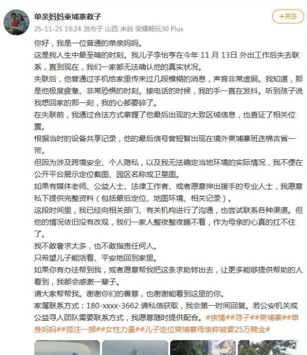 25日,仝卓在社交平台上发文向网友求助,称弟弟在柬埔寨失联!他表示:“紧急!我是仝卓,是失联者的哥哥。阿姨现在状态很差,我替她把家里的状况说出来,希望能让更多人看到。我和弟弟小时候一起长大,从来没想过有一天,会用这种方式去找他。弟弟在11月13日外出工作后失去联系,最后一次出现的位置我们已经掌握。阿姨已经尽力了,也通过各种方式在找人。我们也愿意把完整资料私下提供给真正能够帮助到我们的机构和人士。这是阿姨发布的求助信息,如果您愿意帮忙转发、或者提供任何合理的建议,我们全家都会非常感激。阿姨现在每天都在等一句‘我回来了’,我也希望,那个陪我长大的弟弟还能回来。感谢每一位转发的好朋友。”