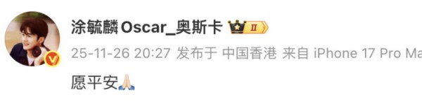 11月26日下午,香港大埔宏福苑发生火灾。当晚,欧阳震华、林夏薇、奥斯卡等明星纷纷在社交媒体平台发文为火灾中的的受灾人民祈福。愿平安!