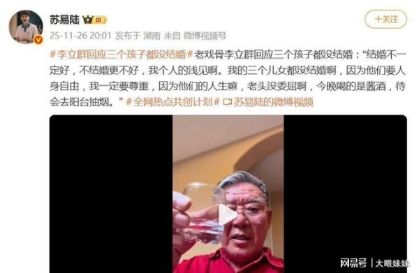 在直播中,李立群丝毫没有“催婚家长”的焦虑,反而显得格外淡定。他明确表达了自己的“浅见”——“结婚不一定好,不结婚更不好”,但话锋一转,强调子女们追求的是“人身自由”,自己必须尊重,“因为他们的人生嘛”。他透露,自己和老伴从不催婚,对子女的感情问题秉持“绝对不干预、不参与”的原则,顶多在对方人品存疑时婉转提醒一句。他还直接驳斥了“不结婚就等于不孝”的封建观念,用一句“儿孙自有儿孙福”轻描淡写地带过,最后以“老头没委屈啊,今晚喝的是酱酒,待会去阳台抽烟”收尾,真实得让网友直呼“潇洒”。