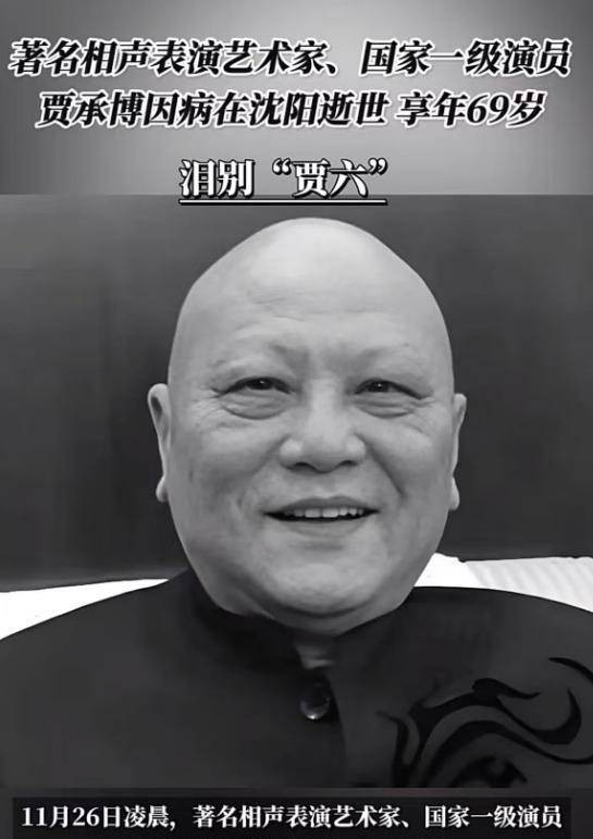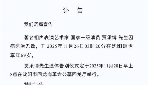 贾承博于2025年11月26日凌晨因病去世,享年69岁。讣告中未明确透露死因。 告别仪式定于2025年11月28日上午8点在沈阳市回龙岗革命公墓回龙厅举行,许多圈内好友将前去送别。 最近几年,贾承博逐渐退出舞台,但本人未告知原因。 圈内人士苗阜在社交平台晒出黑白照片悼念,葛鸿亮晒出与贾承博合影,合影中贾承博面部有些憔悴与浮肿,但精神状态不错。 网友也纷纷怀念其带来的快乐,并表示现实中见过贾承博,说话特别好。