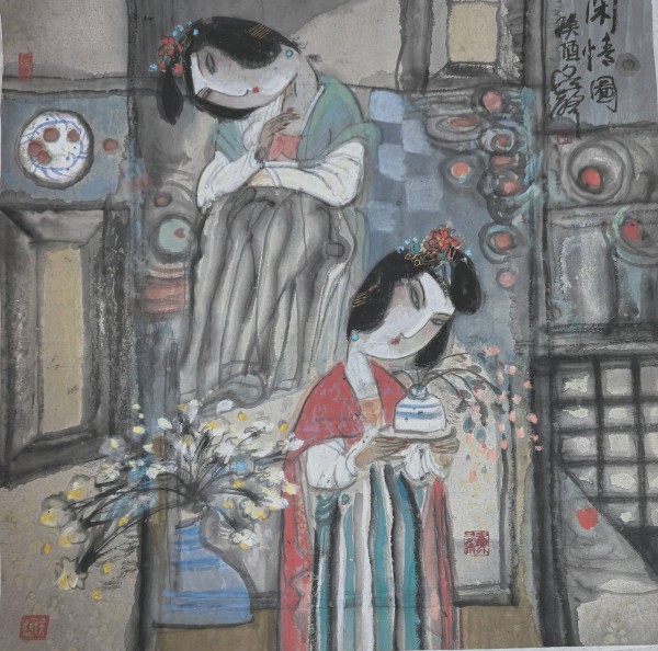 此次展览聚焦唐仕女题材,以刘禹锡、王维、韦应物等唐代诗人的经典诗句为创作蓝本,笔下丰腴灵动的女性形象,线条融合敦煌壁画的韵律与江南水墨的柔婉,既贴合唐代“以胖为美”的审美风尚,又暗藏鲜明的当代意趣。看似写古之作,却因笔墨节奏、色彩晕染里的现代表达,即便多为早年创作,如今看来依旧耳目一新,其藏于古典形制中的当代创意,更有不落窠臼的艺术巧思。