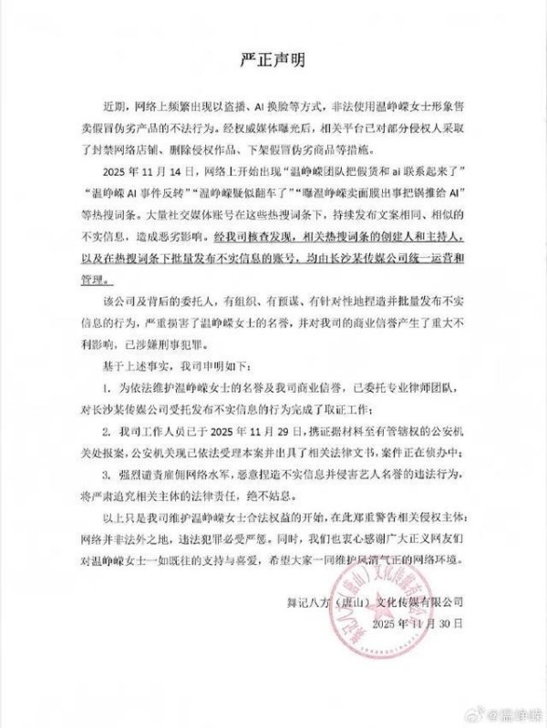 12月1日,演员温峥嵘发文称报警立案,并发出严正声明,部分内容如下:近期,网络上频繁出现以盗播、AI换脸等方式,非法使用温峥嵘女士形象售卖假冒伪劣产品的不法行为。经权威媒体曝光后,相关平台已对部分侵权人采取了封禁网络店铺、删除侵权作品、下架假冒伪劣商品等措施。