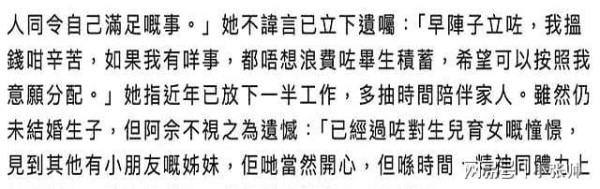 她提到,希望将自己的财富分给最亲近的家人,这一选择不仅是对物质的安排,更是对情感的关怀。