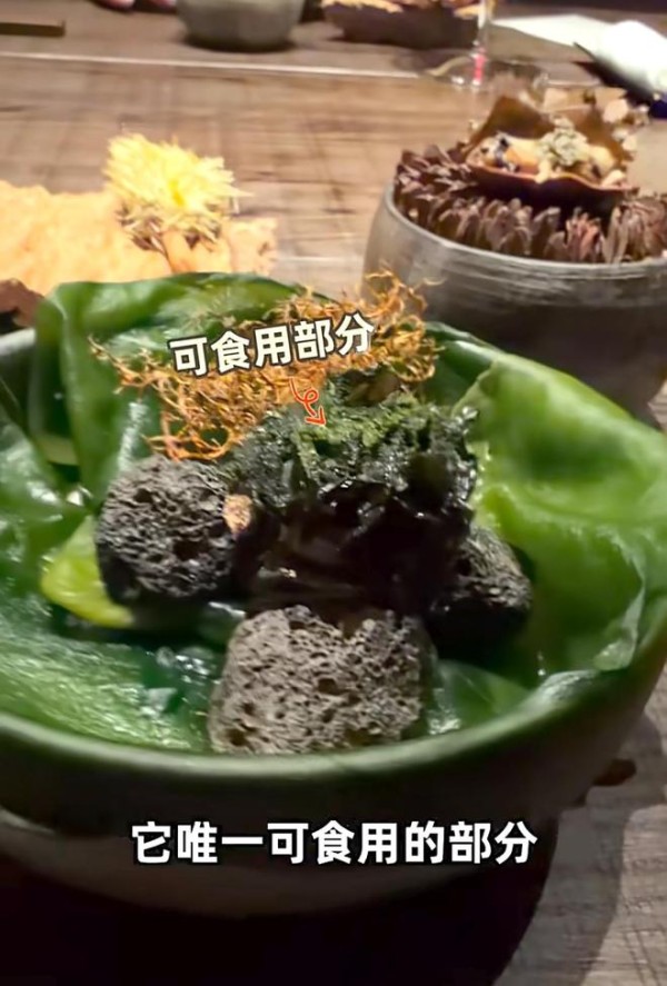 兰斋属于高端创意料理,去这里吃饭,与其说是吃饭,不如说是去听主厨讲故事,去看食材被做出花来。上桌的第一道菜,就让张静初震惊了,因为一个汤碗大小的碗里,铺着一层海带,里面放了3颗石头,有一些海藻和不知名的枯枝。