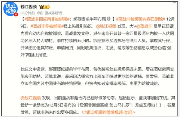 12月9日,蓝战非自曝在南非旅游时被绑架,对方还取了他的精液等东西,随即遭到质疑。有人猜测他是自导自演,也有人怀疑他遭到了仙人跳。对此,惊魂未定的蓝战非火速辟谣,双方辟谣,并曝出更多细节。