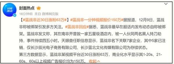 其实网友质疑蓝战非也并非完全没有根源,早年蓝战非为了流量,经常发布了一些十分夸张的表态。比如12月8日发布的标题就成自己“差点又嘎了”。而且蓝战非的商业价值实在太高了,通过这些在30天内涨粉63万,视频报价均价居然达到了150万。