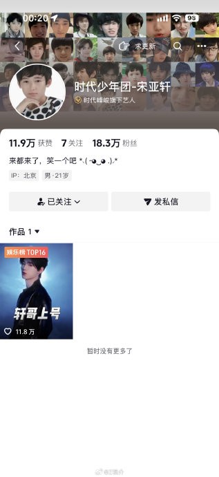 #王牌对王牌[超话]# 【#宋亚轩第一条抖音#】轩哥抖音首秀来了!王牌家族@时代少年团-宋亚轩 带着他画风清奇的抽象头像和背景上线啦