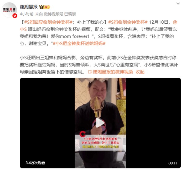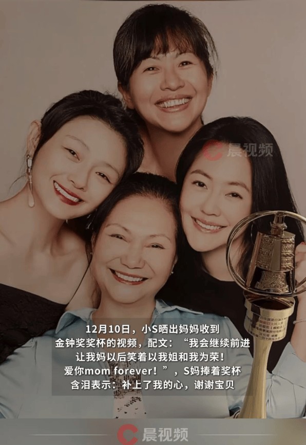 12月10日,小S晒出妈妈收到自己送给她的金钟奖奖杯的视频,配文:“我会继续前进,让我妈以后笑着以我姐和我为荣!爱你mom forever!”,视频中,S妈捧着奖杯,眼含热泪表示:“补上了我的心,谢谢宝贝。”