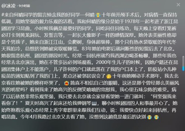 好友王明强也透露,何晴60岁才退休,生命的最后几年还在嘱托他找一些档案。原来何晴的工作关系一直都在浙江昆剧团,她希望能把退休的工龄给续上,可惜一直没能如愿。