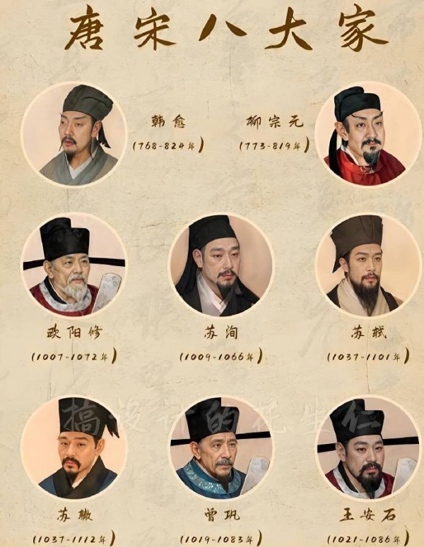还有一点,那就是“圈子”问题。唐宋八大家之间关系很好,经常在一起交流。其中,韩愈与柳宗元两人并称“韩柳”,而欧阳修提携了苏洵、苏轼、苏辙父子三人,曾巩和王安石也曾师从其门下。