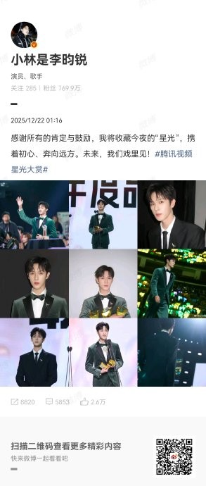 李昀锐全黑西装亮相星光大赏红毯,超萌三连拍感谢粉丝