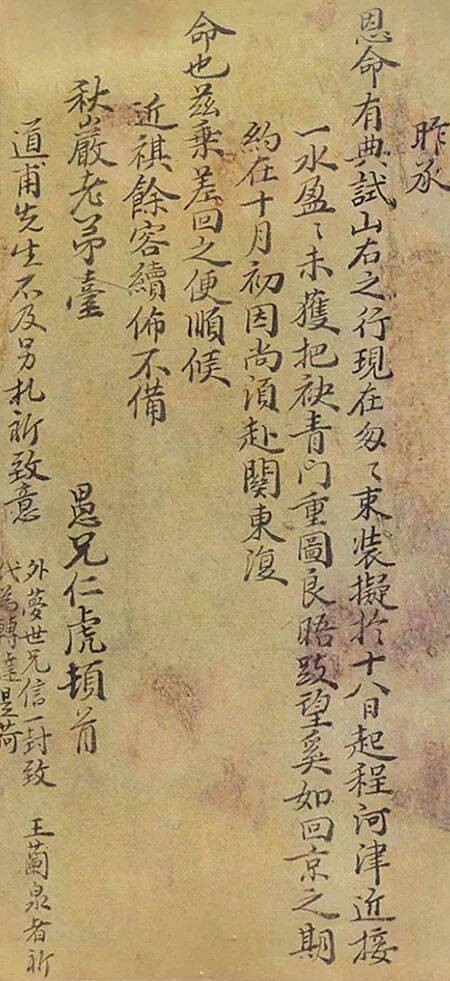 418王士禛手札,内云“无时忘我道扶”,并称年兄。按秀水曾王孙字道扶,与王士禛同举顺治十五年进士。曾王孙初授陕西汉中府推官,康熙六年为总督白如梅以“狥庇”罪名奏罢,后于康熙九年上疏自讼其冤,始获昭雪(见《清风堂文集》卷五《讼冤疏》)。札云“初闻年兄诖误之信,不胜惊惋”,即指此事。作于康熙六年闰五月二十八日。