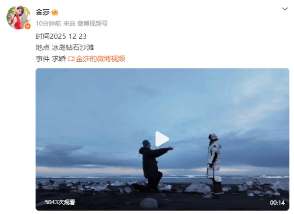 12月24日,金莎在社交平台晒出一段视频,官宣自己被男友孙丞潇求婚的喜讯,还附上了一段配文:“时间2025.12.23,地点:冰岛钻石沙滩,事件:求婚。”有网友称二人是现实版《狙击蝴蝶》!