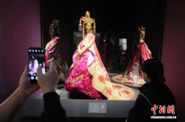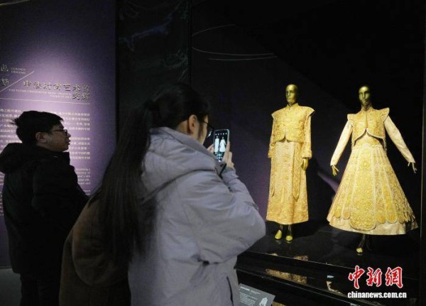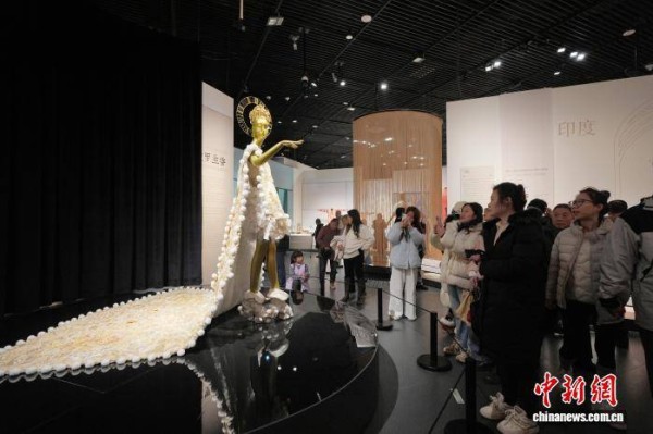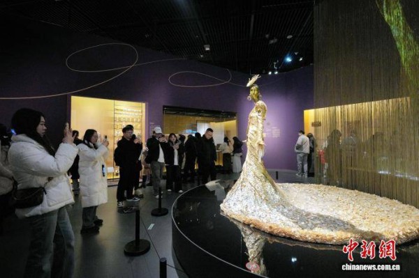 1月1日,成都博物馆前来参观的市民、游客络绎不绝,大家有序参观,在浓浓的文化氛围中度元旦假期。图为民众在成都博物馆拍摄《“金线——从北非到东亚的黄金服饰风尚”特展》。中新社记者 安源 摄