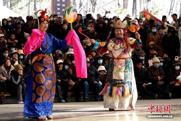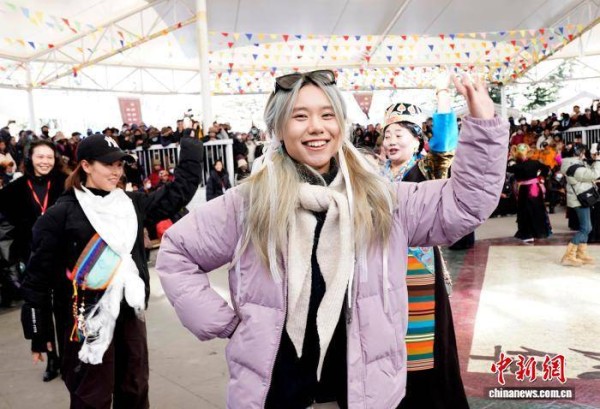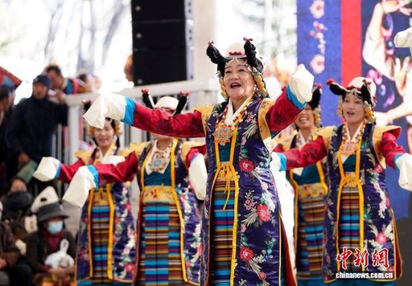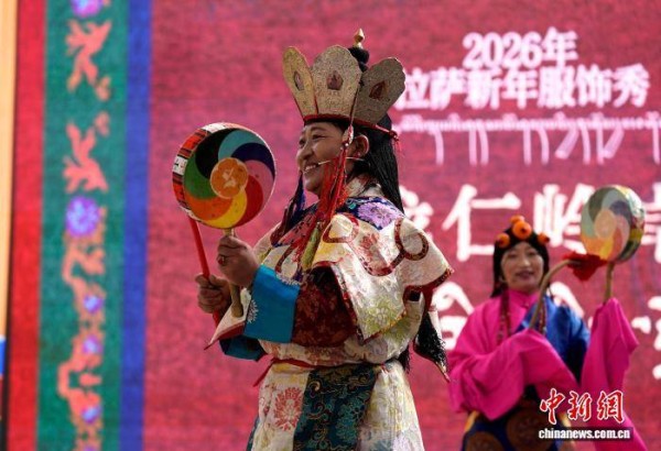 1月2日,“新岁风华,衣彩拉萨”2026年拉萨新年服饰秀子活动在布达拉宫脚下的宗角禄康公园举行。活动分为拉萨非物质文化遗产代表性项目演艺服饰秀与农牧民妇女“村T”秀两部分,通过演艺服饰与日常生活劳动服饰及场景的展示,生动呈现拉萨独特的地域文化与民族风情。图为拉萨非物质文化遗产代表性项目演艺服饰秀现场。中新社记者 李林 摄