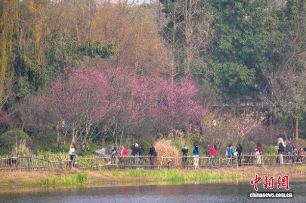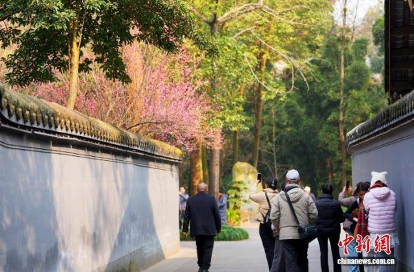 1月12日,成都杜甫草堂梅花绽放,引来众多游客参观游览。图为游客在杜甫草堂浣花溪园区游览。中新社记者 安源 摄