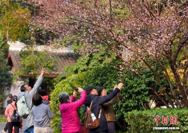 1月12日,成都杜甫草堂梅花绽放,引来众多游客参观游览。图为游客在杜甫草堂拍摄梅花。中新社记者 安源 摄