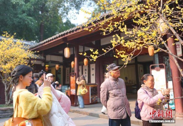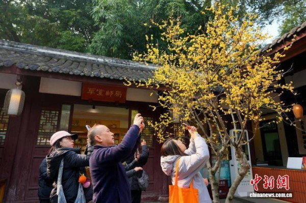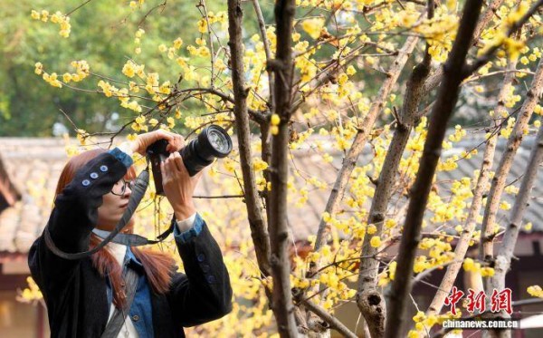 1月12日,成都杜甫草堂梅花绽放,引来众多游客参观游览。图为游客在杜甫草堂拍摄蜡梅花。中新社记者 安源 摄