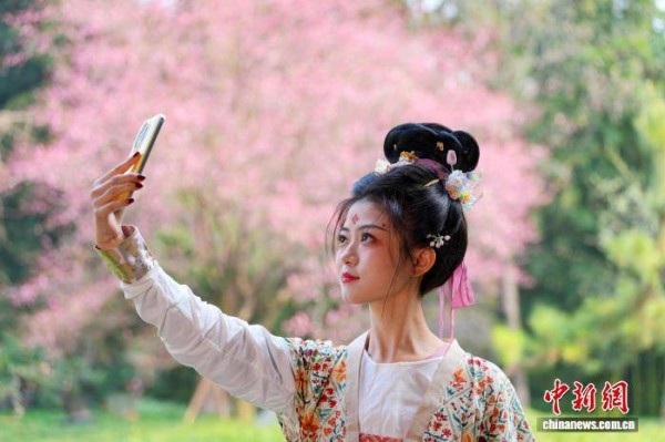 1月12日,成都杜甫草堂梅花绽放,引来众多游客参观游览。图为游客身着古装在梅花树前拍照留念。中新社记者 安源 摄