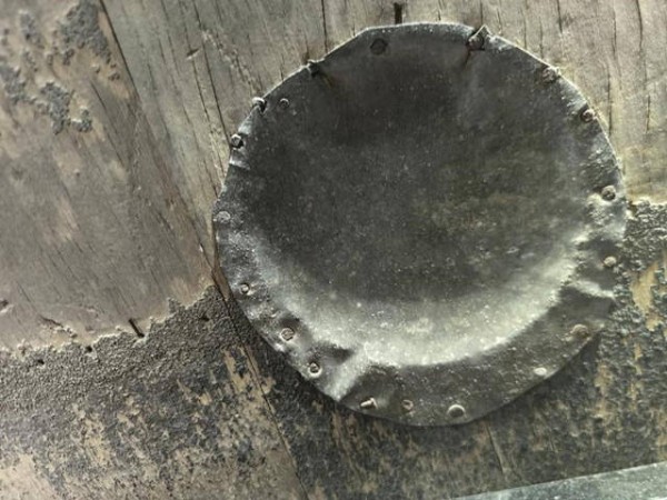 舱板背面,油漆脱落得十分厉害,已经露出木质舱板的本来面目,背面同样有6个孔洞,上方3个孔洞已被铁皮封住,下方3个孔洞只封住了1个。从工艺来看,铁皮并不规则,剪裁的工艺也不成熟,铁钉锈迹斑斑且钉得不扎实,并不具备工业性能,应当是上一位使用者的个人行为。从舱板左侧侧面看,舱板厚度3.50cm,有明显的分层,属于压合板工艺。舱板右侧侧面并非实心舱板,而是由横向木条间隔开的半实心状。从其用途可知,这样既能很好地减重,也能隔离抗压。