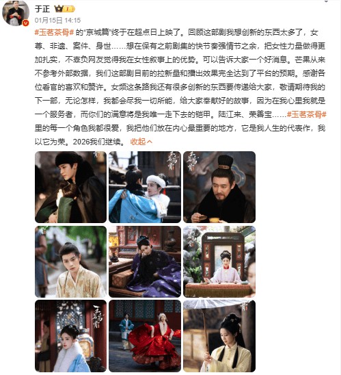 “这部剧我想创新的东西太多了,女尊、非遗、案件、身世……想在保有之前剧集的快节奏强情节之余,把女性力量做得更加扎实,不辜负网友觉得我在女性叙事上的优势。可以告诉大家一个好消息。芒果从来不参考外部数据,我们这部剧目前的拉新量和播出效果完全达到了平台的预期。感谢各位看官的喜欢和赞许。女频这条路我还有很多创新的东西要传递给大家,敬请期待我的下一部,无论怎样,我都会尽我一切所能,给大家奉献好的故事,因为在我心里我就是一个服务者,而你们的满意将是我唯一走下去的铠甲。《玉茗茶骨》里的每一个角色我都很爱,我把他们放在内心最重要的地方,它是我人生的代表作,我以它为荣。2026我们继续。”