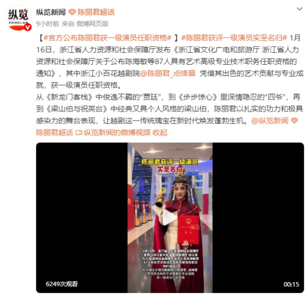 官方公布陈丽君获一级演员任职资格!曾参演越剧《新龙门客栈》