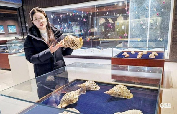 青岛贝壳博物馆工作人员讲解手中贝壳的渊源。