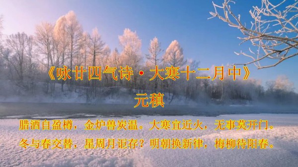 这几首诗,一首比一首冷,但寒潮再盛,也冻不住诗人心底悄然滋长的暖意和对生活的关爱。大寒一过,又开始新的一个轮回,再过十五天,我们就将迎来下一轮的第一个节气:立春。冬去春来,年味渐浓,让我们一起静候那第一缕暖风,轻轻吹散冬日的薄霜。