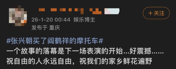 近日,相声演员阎鹤祥在其直播及vlog里透露他将自己的摩托车卖给了张兴朝。网友们纷纷表示“一个故事的落幕是下一场表演的开始”,“刚开始感觉惋惜,但是出给张兴朝,又觉得是个好去处”。