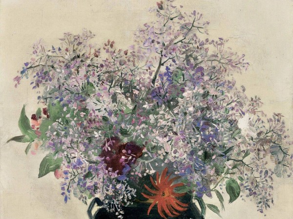 作品没有复杂的背景,只有几瓣落花与极淡的影,这“留白”恰是东方美学最自信的表达,不解释,不填满,画中紫色丁香如烟霞朦胧,桌面隐去,只留几片落花与浅影,满满东方留白的韵味。花瓶平涂宁静,花枝松散恣意——吴冠中笔下的中西融合,温柔又坚定。让你听见花开的声音,闻到时光拂过的气息。