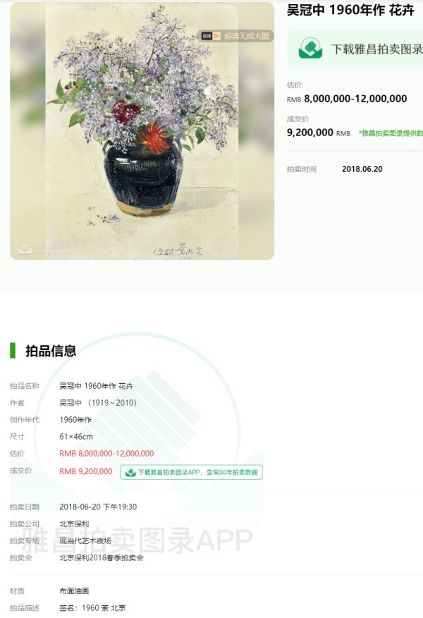 七年时间艺术价值没怎么跌,摩擦了佣金成本,印象里似乎有过千万的作品,查了下,最高价就是这件花卉和老虎同价,老虎拍过多次,没有这件花卉吸引人…看来上千万现在是个大门槛~