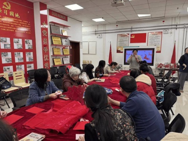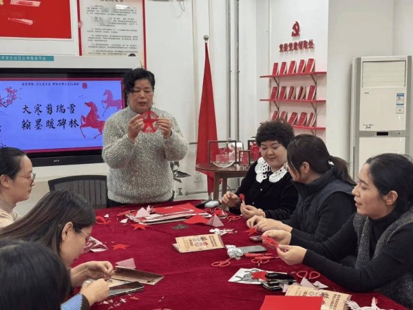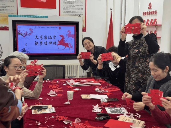 在杨老师的指导下,辖区群众热情高涨,纷纷动手参与创作。居民认真细致地刻画细节,邻里之间互相交流技巧、分享心得,现场充满欢声笑语。一张张普通的红纸在大家的指尖流转间,变成了一幅幅寓意吉祥的剪纸作品,既有传统韵味,又融入了碑林文化元素和新春祝福。
