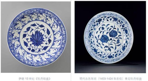 以本次展览中的伊朗15世纪《牡丹纹盘》为例,其风格与明代永乐年间的青花牡丹纹盘非常接近。