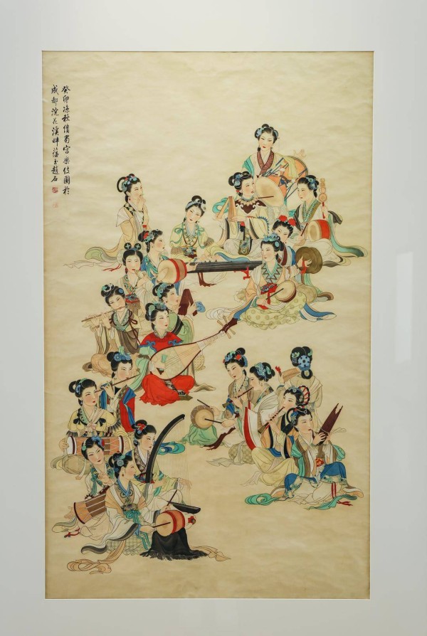 在最终完成的画作中,赵蕴玉将22位乐伎和她们使用的乐器,在画面中安排得错落有致,婉转灵动,可谓“一肌一容,尽态极妍”,成为现代工笔人物画的精品。据介绍,此画共有三个版本,此次在成博展出的是赵蕴玉自己最满意的一幅。