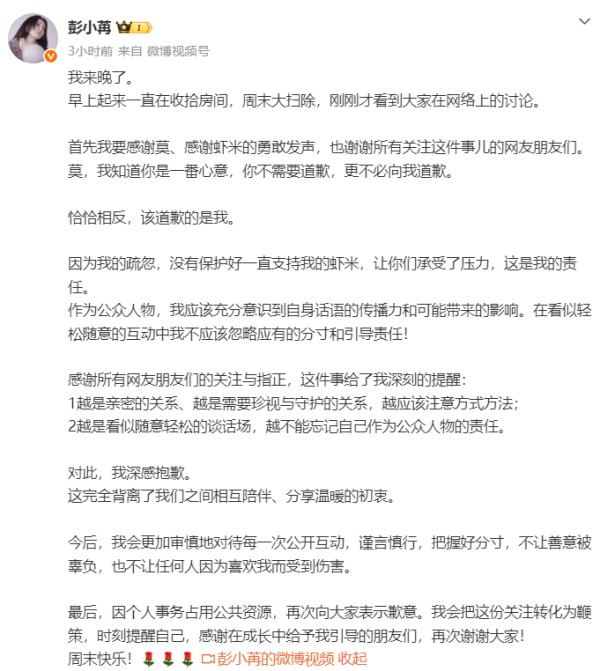 25日下午,彭小苒发视频道歉,“你不需要道歉,更不必向我道歉,该道歉的是我”。彭小冉也表示之后会谨言慎行,把握好分寸,不让善意被辜负。