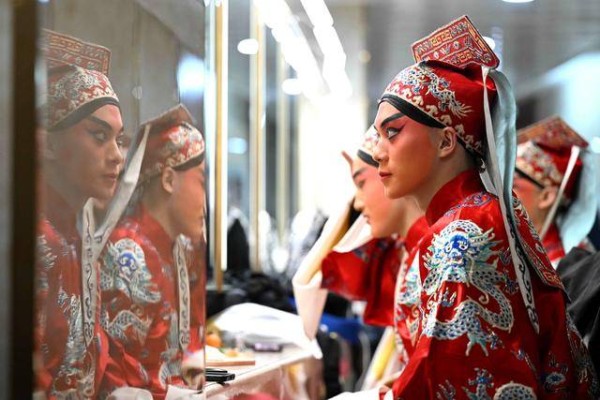 ↑ 1月25日晚,中国戏曲学院演员在河北省石家庄市人民会堂表演京剧《龙凤呈祥》前试装。新华社发(陈其保摄)
