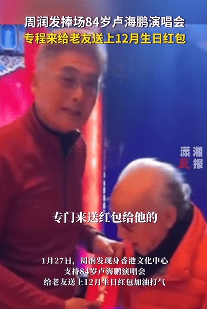1月27日,周润发现身香港文化中心,前去支持老友卢海鹏的演唱会,卢海鹏今年已经84岁,周润发特意为卢海鹏送上了12月的生日红包为他加油打气。