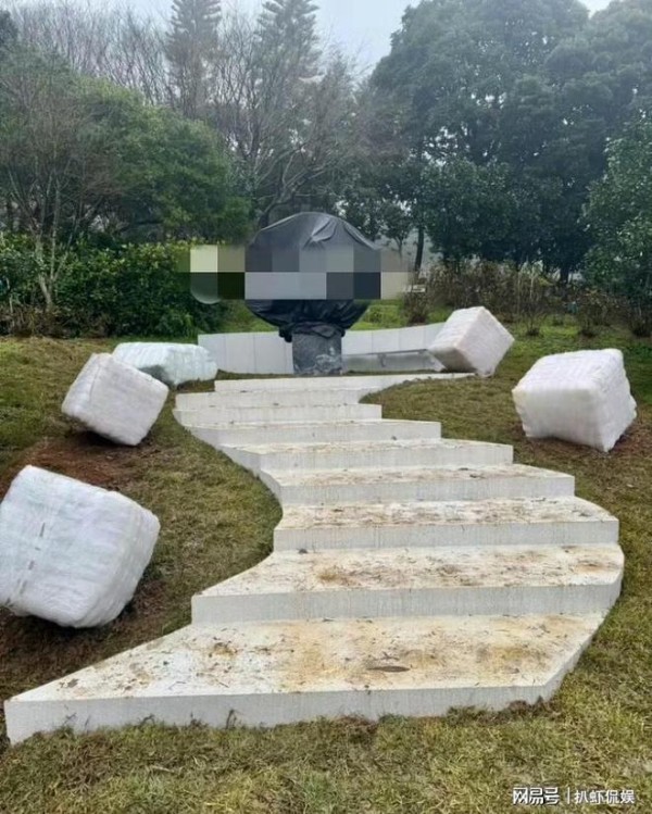 大S的纪念雕像摆放在最上方,前去揭开黑色帆布时还需要走十几个台阶,台阶旁边摆放的有白色方块石头,雕像后面还有曲面墙壁。
