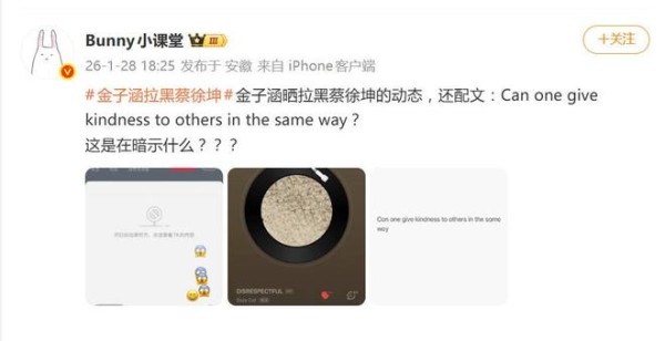 1月28日,已退圈的金子涵在海外社交平台甩出一张拉黑蔡徐坤账号的截图,配上一个简单粗暴的竖中指表情,外加一句意味深长的英文:“能否以同样的方式给予他人善意?”火药味十足的发文,立刻将#金子涵拉黑蔡徐坤#推上热搜榜首,评论区秒变推理现场:这到底是积怨爆发,还是单方面炒作?