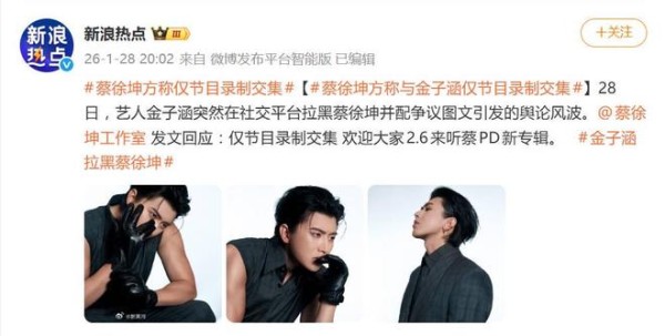 金子涵拉黑蔡徐坤,蔡徐坤工作室回应:仅节目录制交集