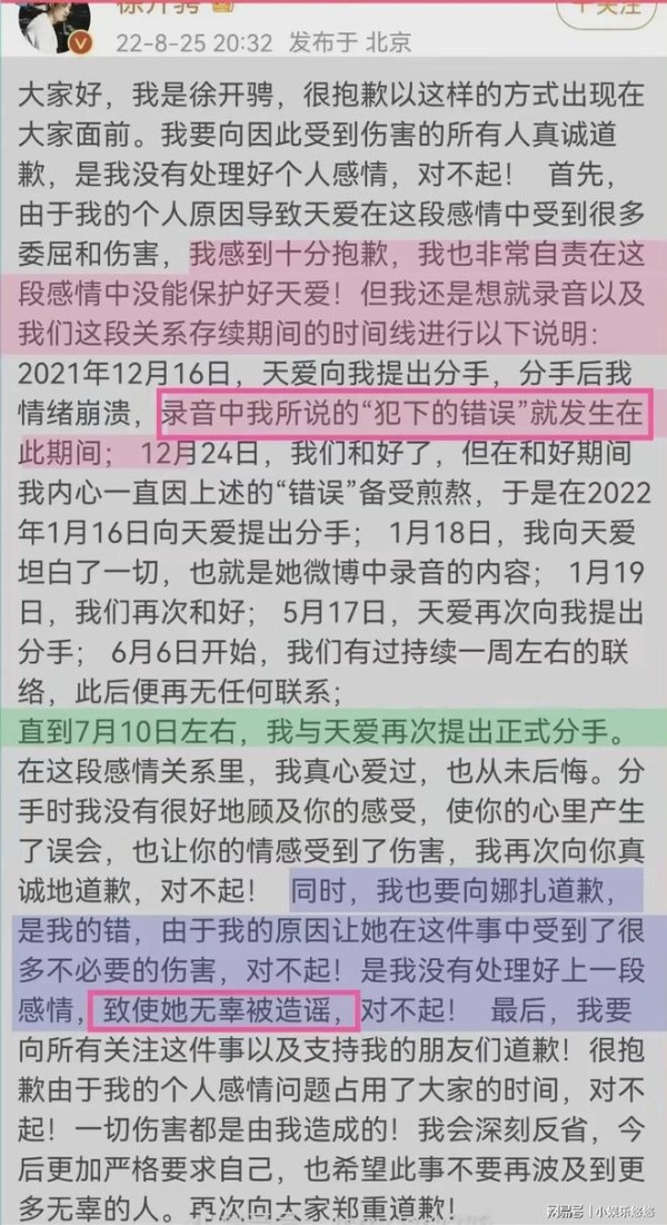 徐开骋发表长文道歉,公开与张天爱四次分手的时间线