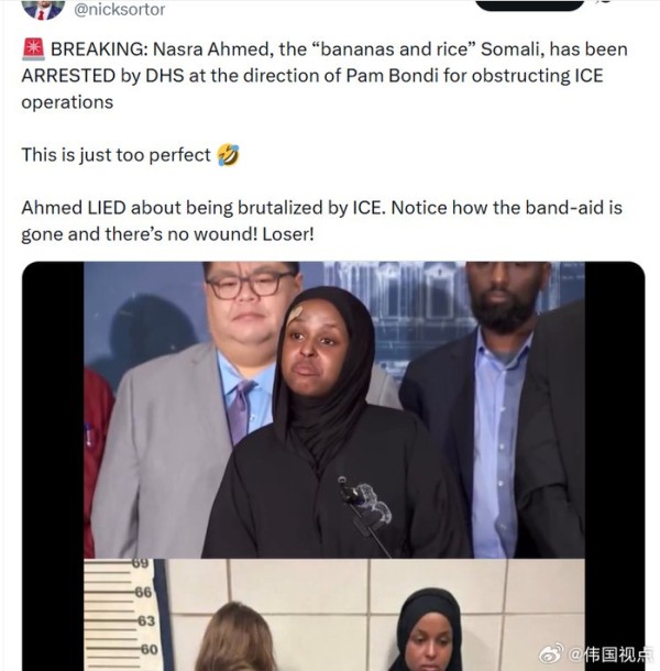 纳斯拉·艾哈迈德,那位“香蕉和大米”的索马里人,已被国土安全部逮捕,原因是妨碍ICE行动,这一行动是由帕姆·邦迪下令的。艾哈迈德撒谎称自己遭到ICE残酷对待。注意她的创可贴已经不见了,而且根本没有伤口!真是个失败者!