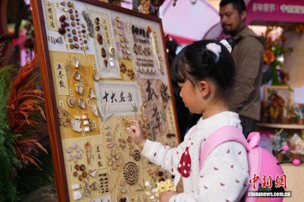 图为活动现场展出的植物装饰画吸引小朋友。中新社记者 刘冉阳 摄