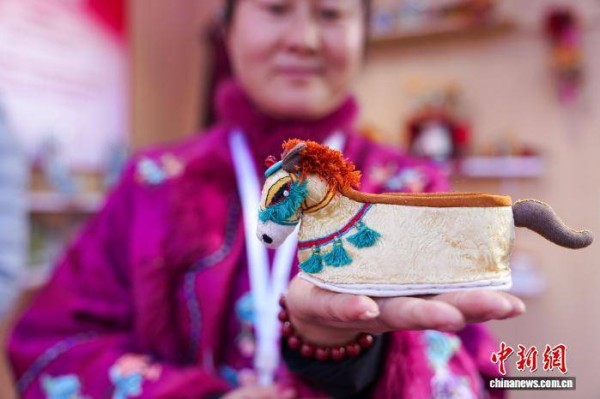 图为非遗代表性传承人展示马头绣花鞋。中新社记者 刘冉阳 摄