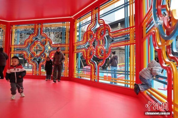 四川成都:融合走马灯、中国结元素的大型装置亮相街头四川成都:大型公共艺术装置“悦动的山丘”吸引民众
