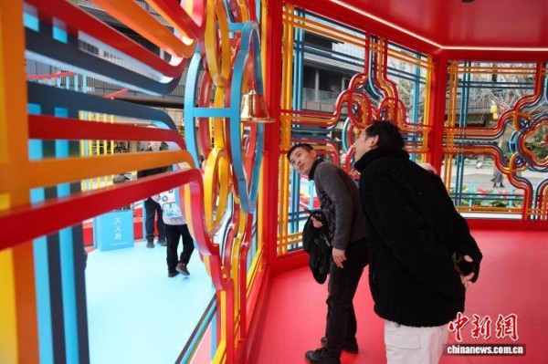 1月30日,四川成都街头一座大型艺术装置吸引市民打卡。这座艺术装置名为《骐骥织光 福马迎春》,其融合了走马灯形态之美与中国结编织之妙,以灵动线条交织传统匠心。中新社记者 张浪 摄